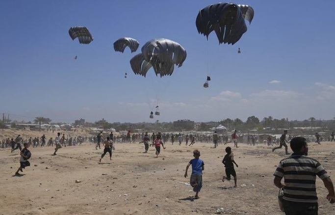 Warga di Jalur Gaza menerima bantuan dikirim melalui udara. PM Israel Benjamin Netanyahu dikabarkan kembali siapkan serangan besar-besaran di Jalur Gaza dengan dalih untuk membebaskan 20 sandera Hamas yang masih hidup.--@6ixbuzztv/x