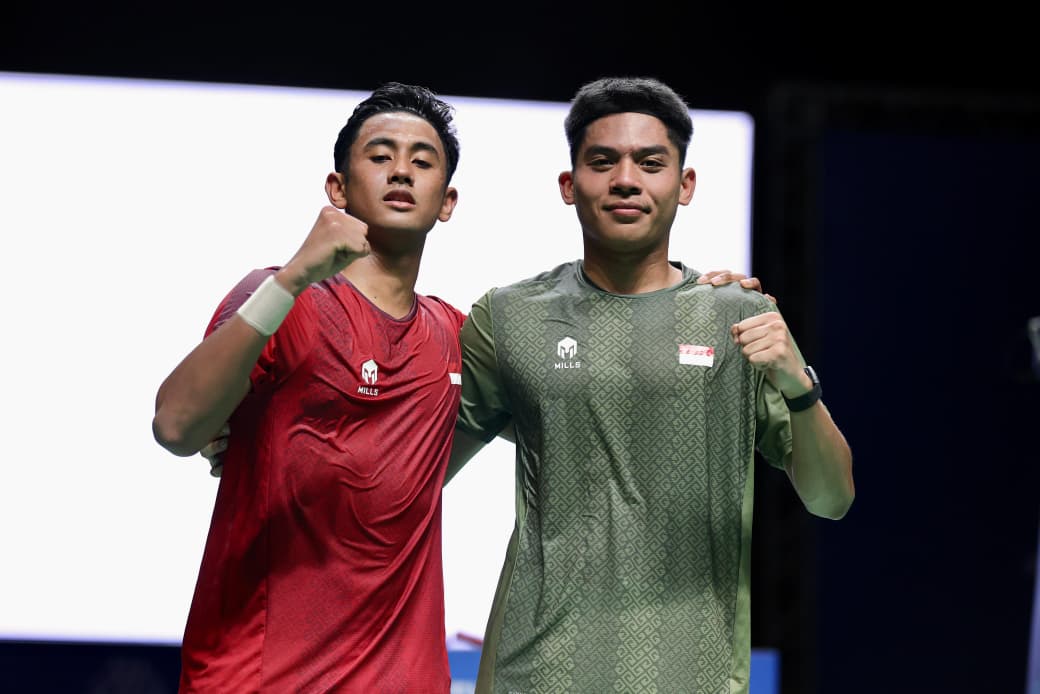sabar karyaman dan reza pahlevi saat memberikan salam penghormatan kepada suporter pada saat tampil di sea games 2025 thailand. -pbsi-